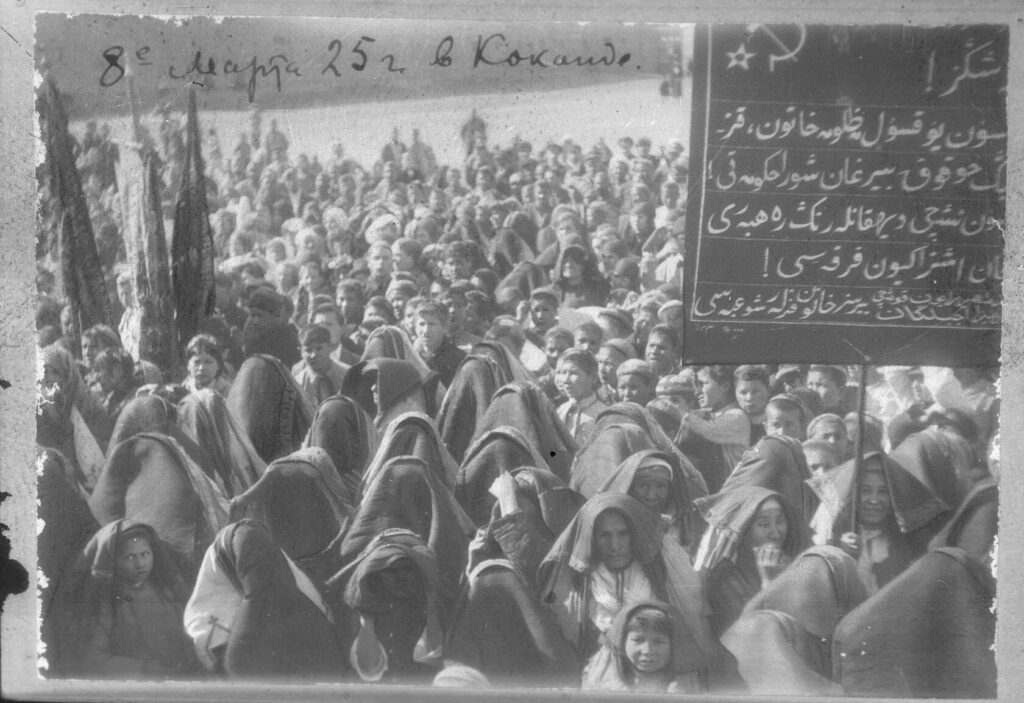 Para 1917, mujeres como Oipocho Djalilova ya desafiaban las costumbres. Oriunda de Tashkent y educada en el jadidismo, apareció en público sin velo dando un gesto pequeño pero simbólico que reflejaba una transformación social más amplia. Durante el Día Internacional de la Mujer de 1922, miles de mujeres de Samarcanda caminaron sin velo por las calles. Dos años después, se celebraron concentraciones similares en los barrios de Tashkent. Estos actos, silenciosos, locales y autoorganizados, demuestran que el movimiento por la liberación femenina no fue simplemente producto de la ideología soviética, sino parte de un despertar intelectual más amplio.