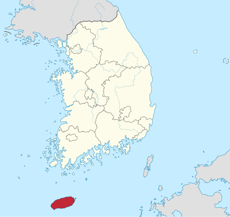 Mapa de Corea del Sur, con la isla de Jeju en rojo. Fuente: Wikimedia Commons