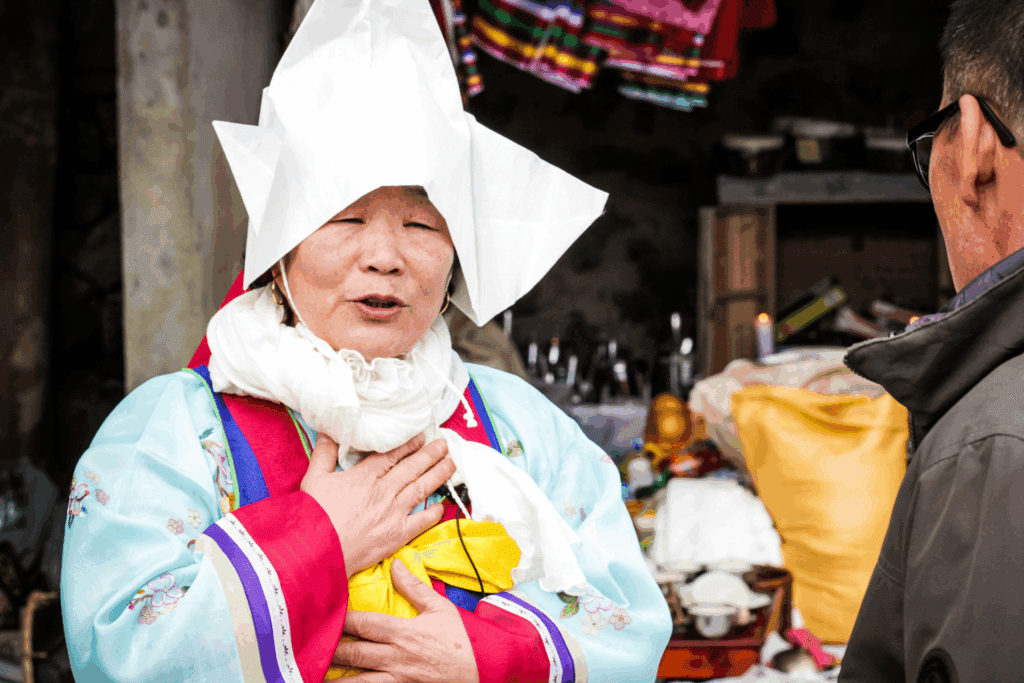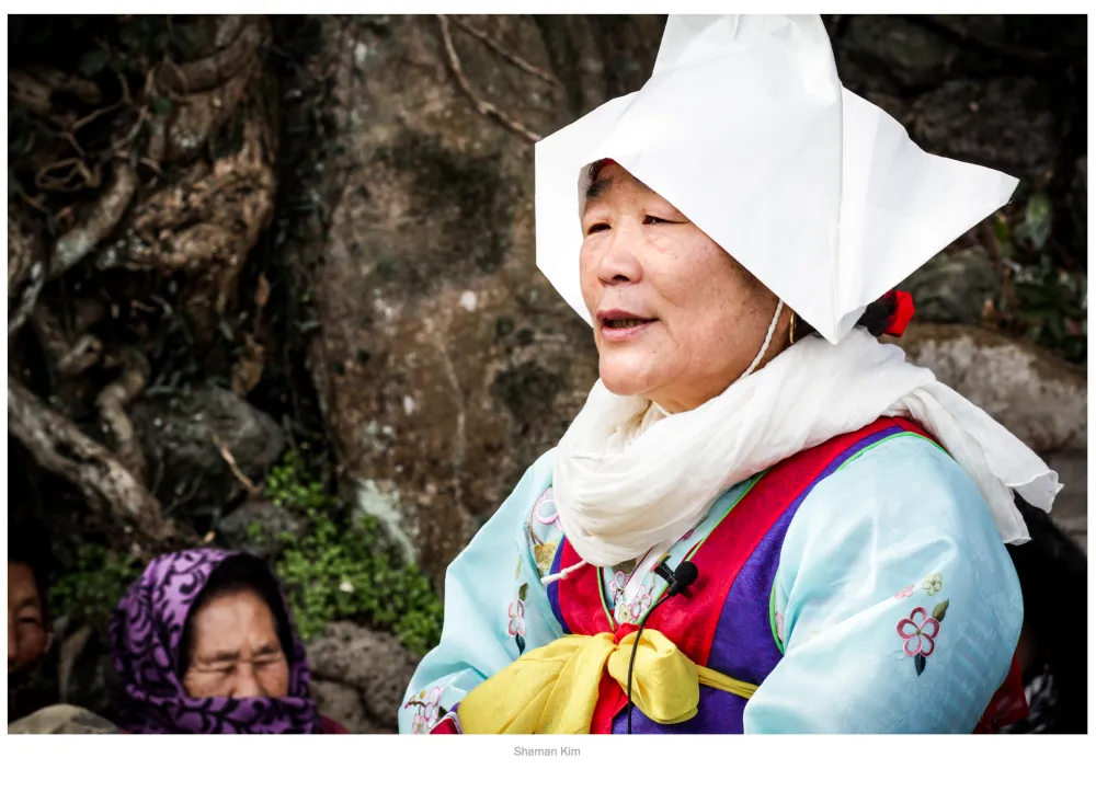 La mitología de la isla de Jeju emerge de una tradición chamánica profundamente enraizada en lo femenino y en la relación entre humanidad y naturaleza. El chamanismo local es un sistema con fuertes rasgos matrilineales3 dominado por shimbang (chamanes4 encargados de mediar entre el mundo humano y el espiritual). Durante los rituales gut, recitan los bon-puri, narraciones versificadas que cuentan el origen de cada deidad. Estos relatos mitifican los paisajes de Jeju, explican la sacralidad de montes, cuevas o árboles, y transmiten valores morales y normas comunales. Así, la palabra ritual se convierte en archivo vivo de la memoria colectiva.