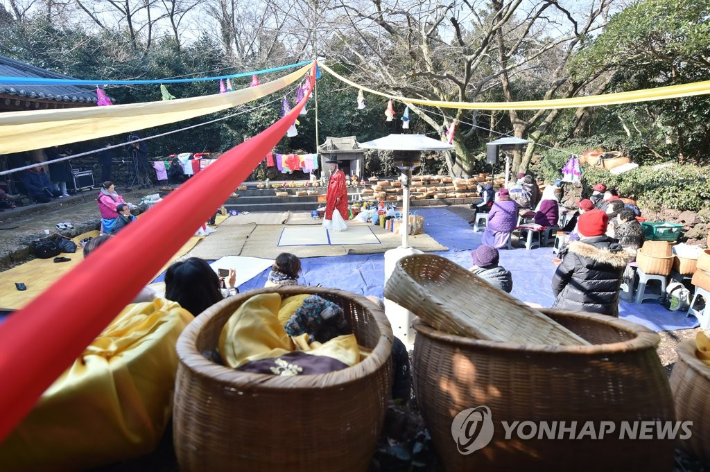 Ritual a gran escala llamado «Singwaseje» (신과세제, Ritual de Año Nuevo) en el Santuario Bonhyangdang en Songdang-ri. Fuente: Yonhap News